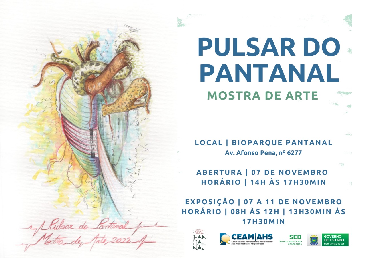 A presente mostra de arte, intitulada “Pulsar do Pantanal”, expressa a compilação poética, tecida pelos estudantes superdotados de forma a trazer o Pulsar do Pantanal narrado pela Arte em temas como: Bioma Pantaneiro, Reflexão Crítica do Contexto Pantaneiro, Mitos e Lendas Pantaneiras, Hábitos e Costumes, Trabalho e Manejo. Tal compilação é socializada com a comunidade por meio da arte, da poesia, do desenho e instalações.