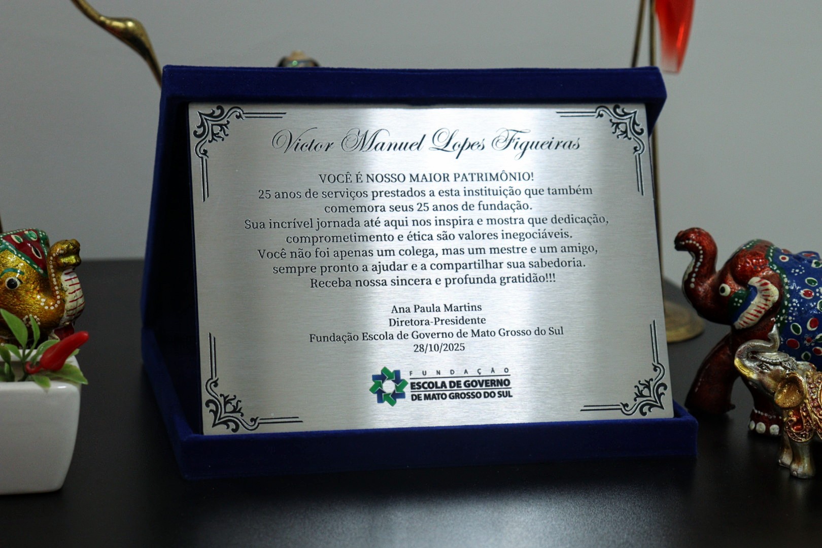 Durante a comemoração dos 25 anos da Escolagov, Victor foi homenageado pela diretora-presidente, Ana Paula Martins, recebendo uma placa de reconhecimento das mãos do governador ,Eduardo Riedel, na cerimônia pública do XX Prêmio Sul-Mato-Grossense de Gestão Pública. A homenagem reconheceu sua trajetória marcada por dedicação, compromisso e significativa contribuição para o crescimento e fortalecimento do órgão.