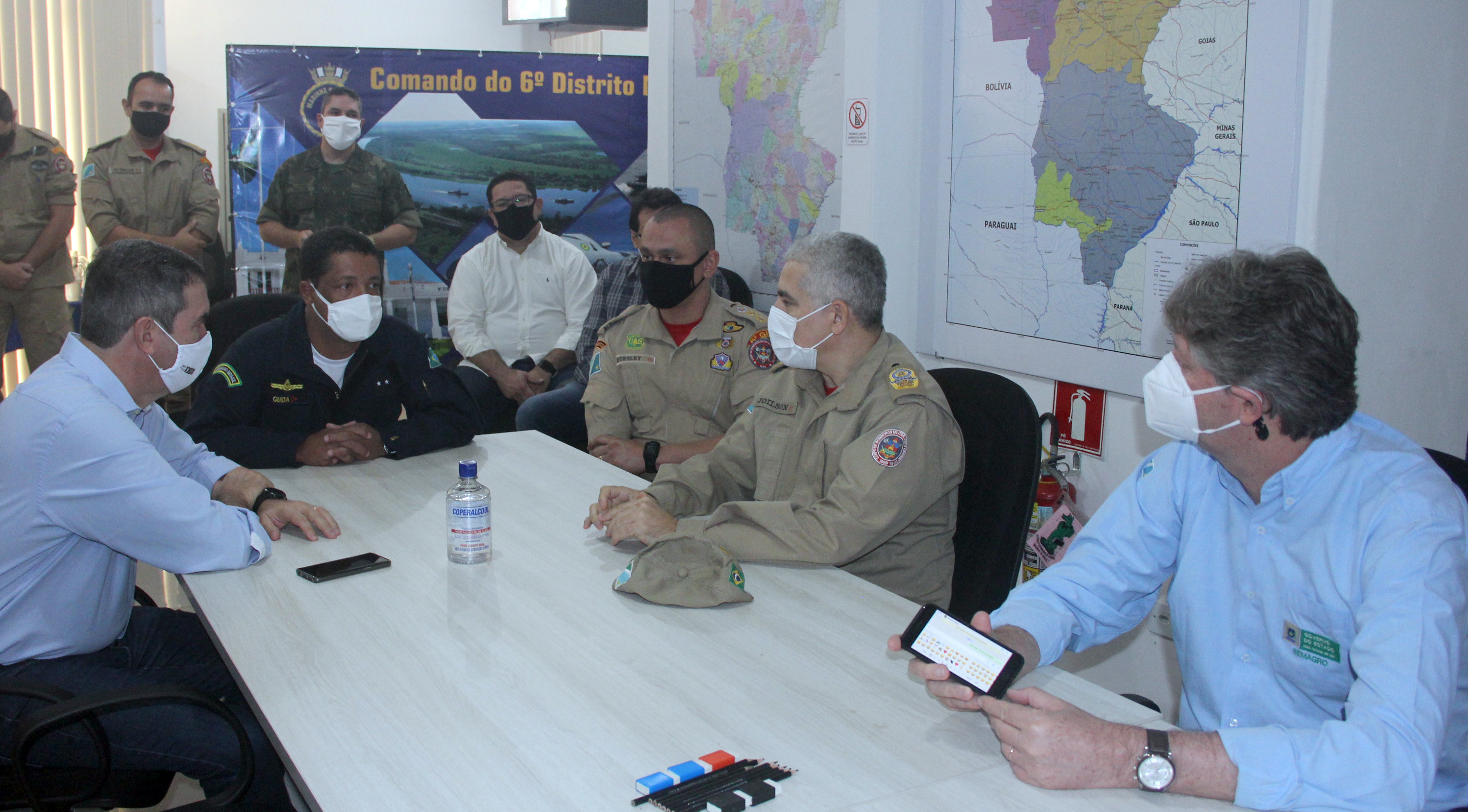 Os secretários, acompanhados do comandante-geral do Corpo de Bombeiros, coronel Joílson Alves do Amaral, e do superintendente regional do Ibama, general Luiz Carlos Marcheti, foram recebidos na Marinha pelo contra-almirante Sérgio Gago Guida, comandante do 6º Distrito Naval.